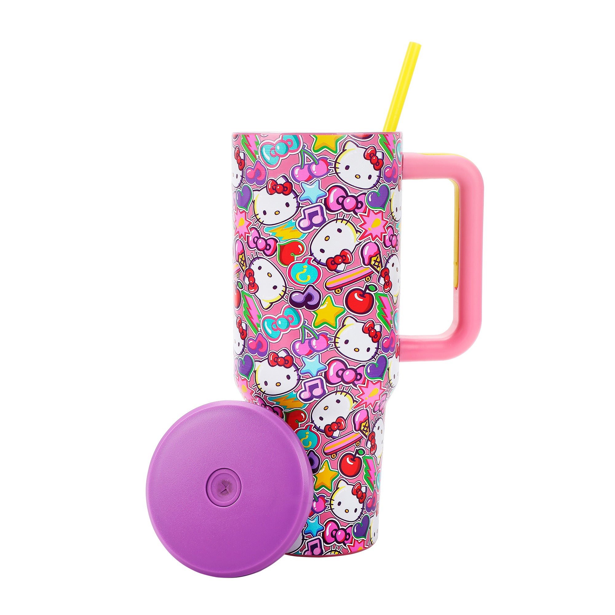 Bioworld Hello Kitty All-Over Print Vacuum Insulated 40 Oz. Stainless Steel Tumbler with Leak-Proof Lid & Chunky Easy Carry Handle for Travel or Home