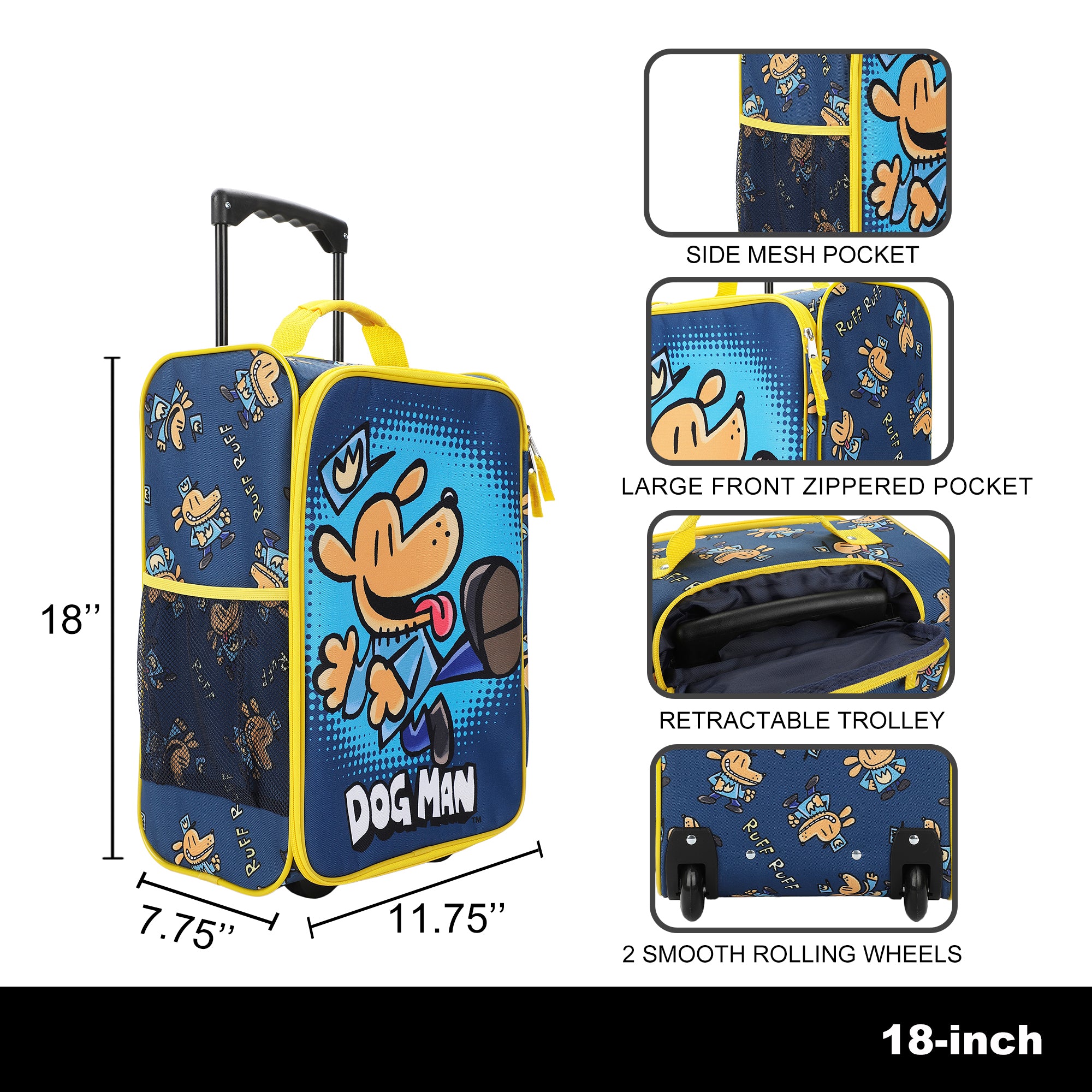 - Custom Design: Showcases a bold Dog Man graphic on the front and playful all-over character print on the sides and back, bringing the fun of Dog Man to every trip. Dimensions: 18"h x 11.75"w x 7.75"d.