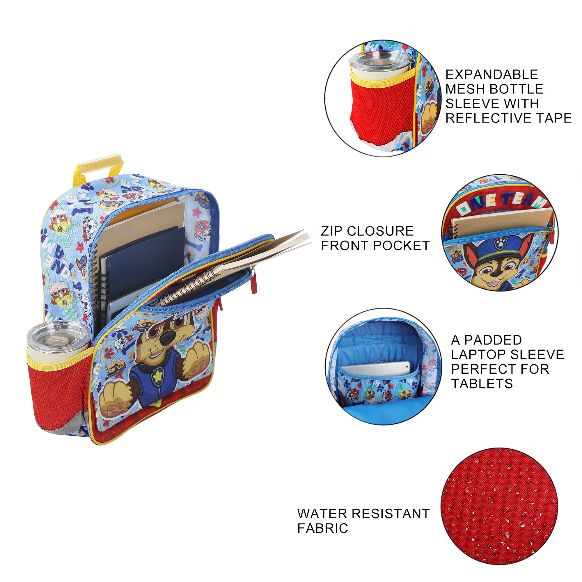 - Custom Design: This 16-inch backpack has been custom-designed with a bright, colorful graphic of Chase, complete with a PU patch of the Paw Patrol Badge, making it the perfect school, work, or travel accessory for Paw Patrol fans!