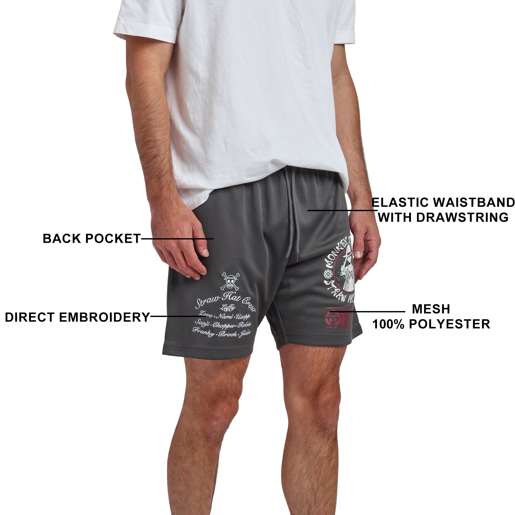 - Custom Design: The character Monkey D Luffy has been professionally printed on the shorts’ left leg, while the right boasts the names of the “Straw Hat Crew,” making these lounge shorts are a must-have for any One Piece fan