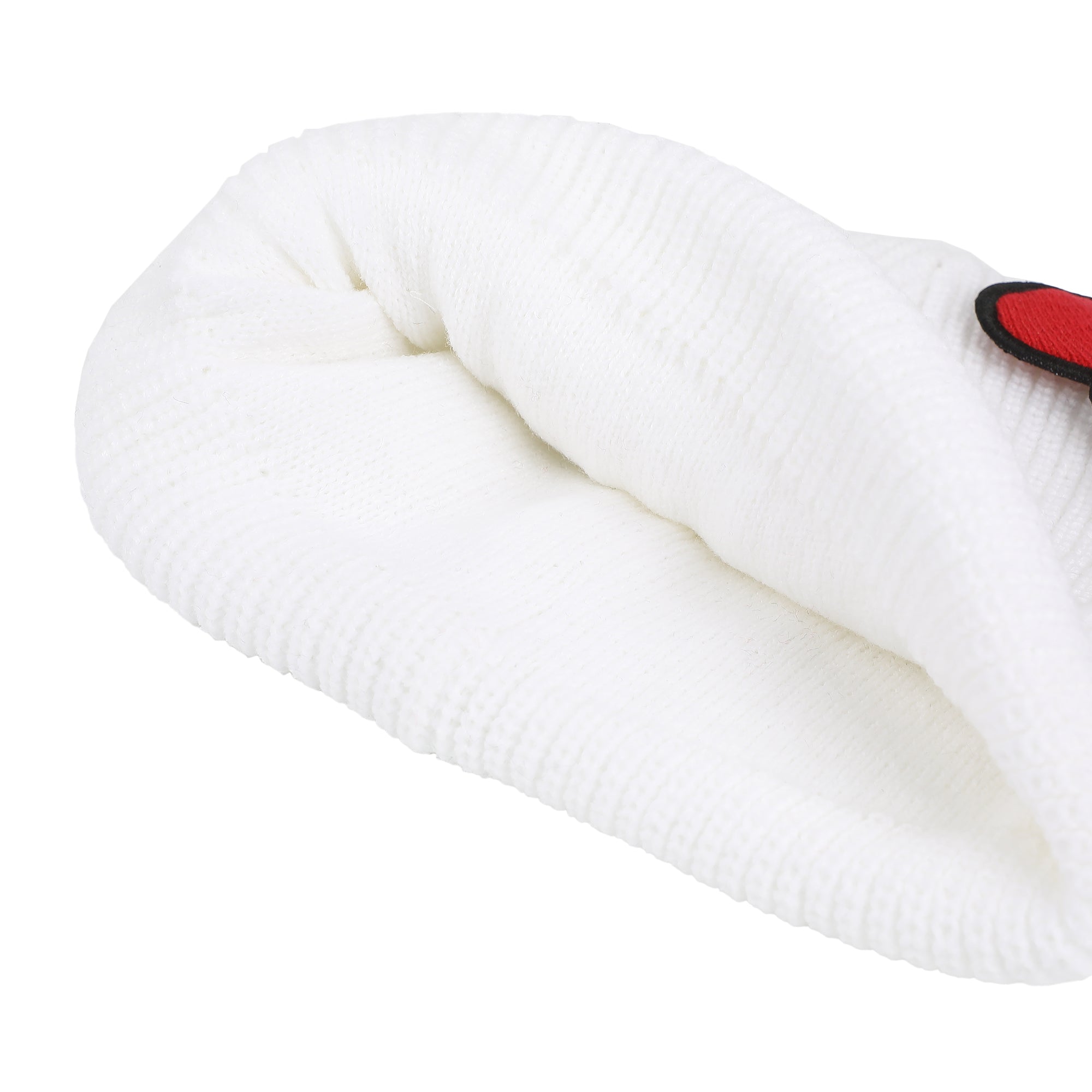 Hello Kitty Novelty Ear White Acrylic Beanie With Cut Fabric Bow With Embroidery And Red Woven Label Cuff Beanie