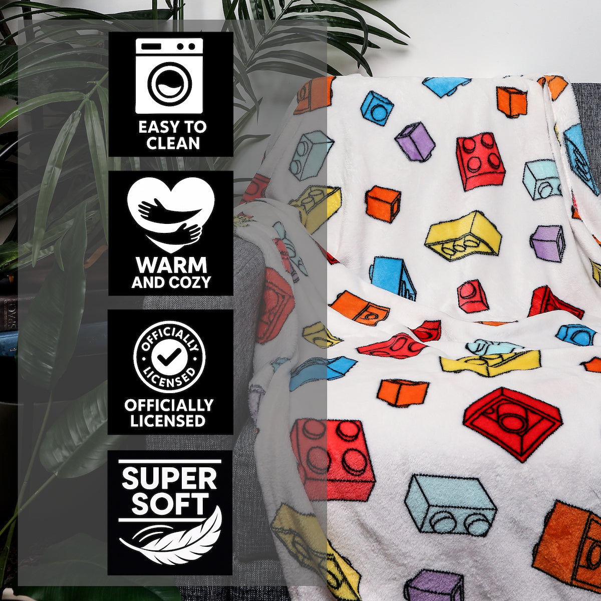 - OFFICIAL PRODUCT: Officially licensed by Lego, this fleece blanket features iconic Lego blocks in different sizes and colors on a white background