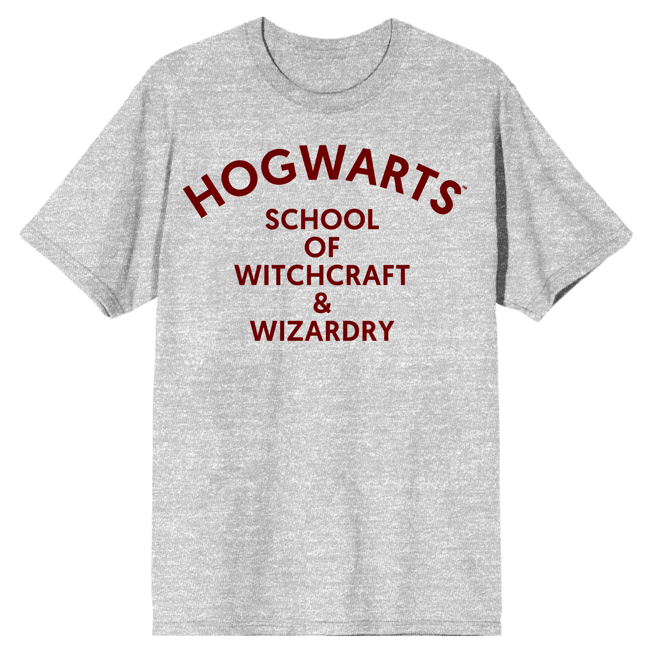 - GRAPHIC TEE: The name and tagline of Hogwarts School of Witchcraft and Wizardry decorate the front of this tee in red letters. Celebrate the school that is close to your heart with this men's t-shirt.