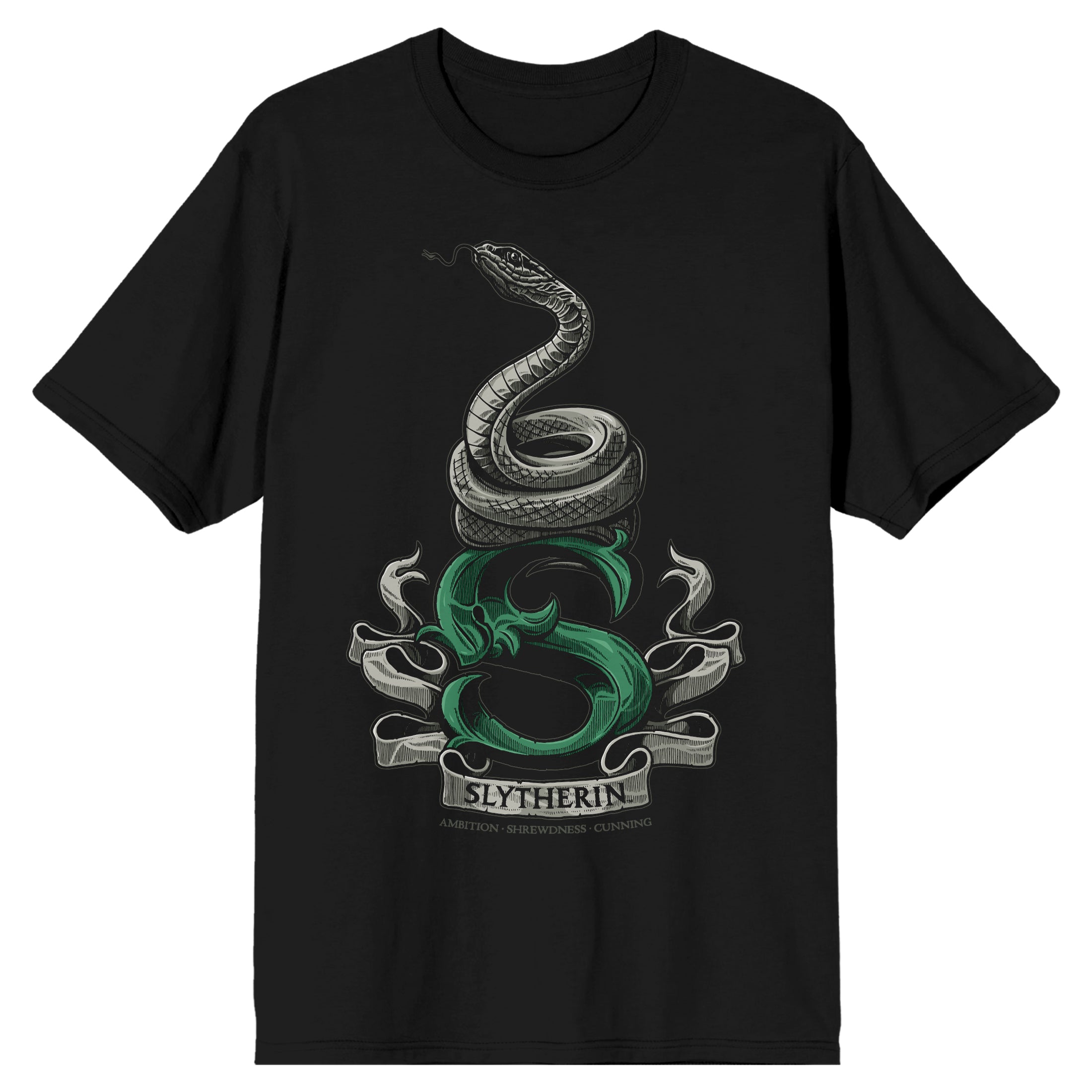 • GRAPHIC TEE: A grey snake curls up on a green S on this graphic tee as grey text below the image shows Slytherin students to have ambition, shrewdness, and cunning. Show your support for the clever house with this t-shirt.