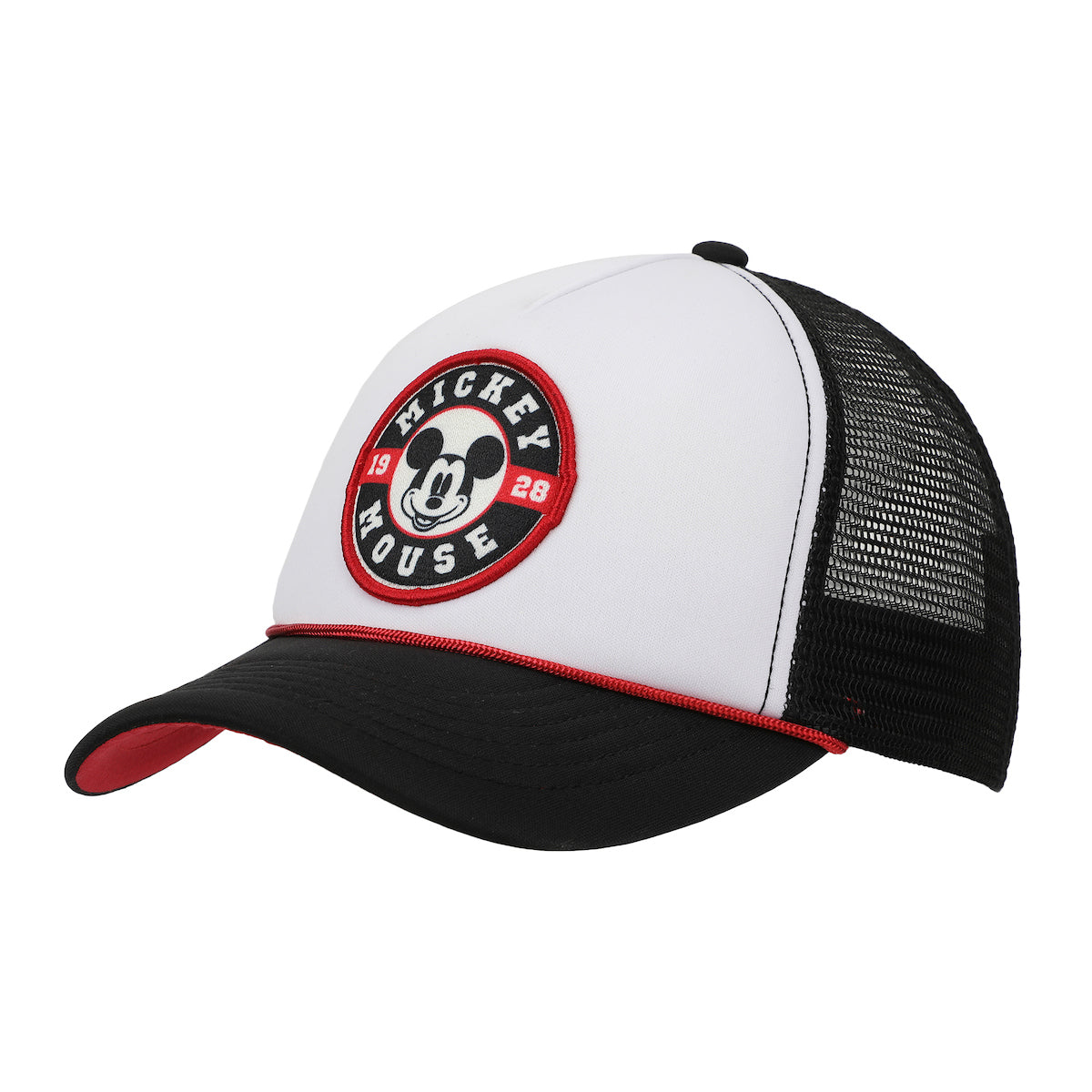 - Add a touch of Disney magic to your outfit with this white trucker hat featuring Mickey Mouse. The hat showcases Mickey's image in a black circle with his name in white text, set above a sleek black foam front panel. The black mesh on the back and sides ensures breathability, while the polyester construction provides durability. With an adjustable strap for a perfect fit, this hat is a stylish and functional choice. For optimal care, hand wash it in cold water and lay it flat to dry.