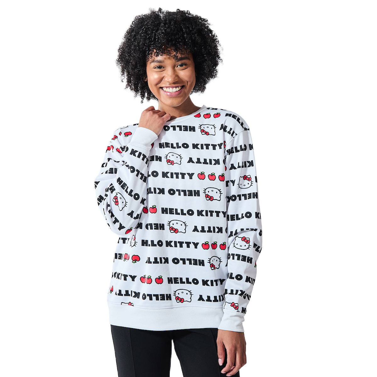 Hello Kitty Repeat Text Women's White Crew Neck Long Sleeve Sweatshirt