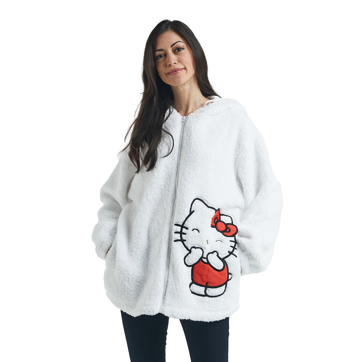 Hello Kitty Women's White Long Sleeve Cosplay Faux Shearling Zip-Up Hoodie