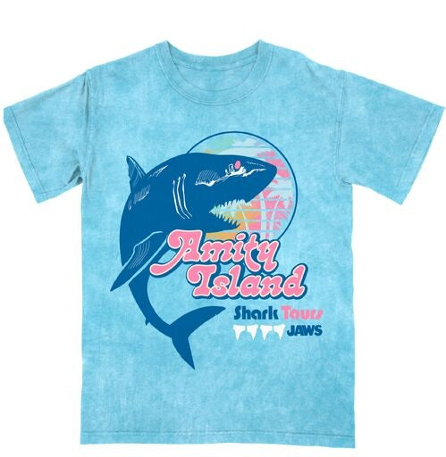 Jaws Amity Island Shark Tours Women's Blue Mineral Wash Crew Neck Short Sleeve T-shirt