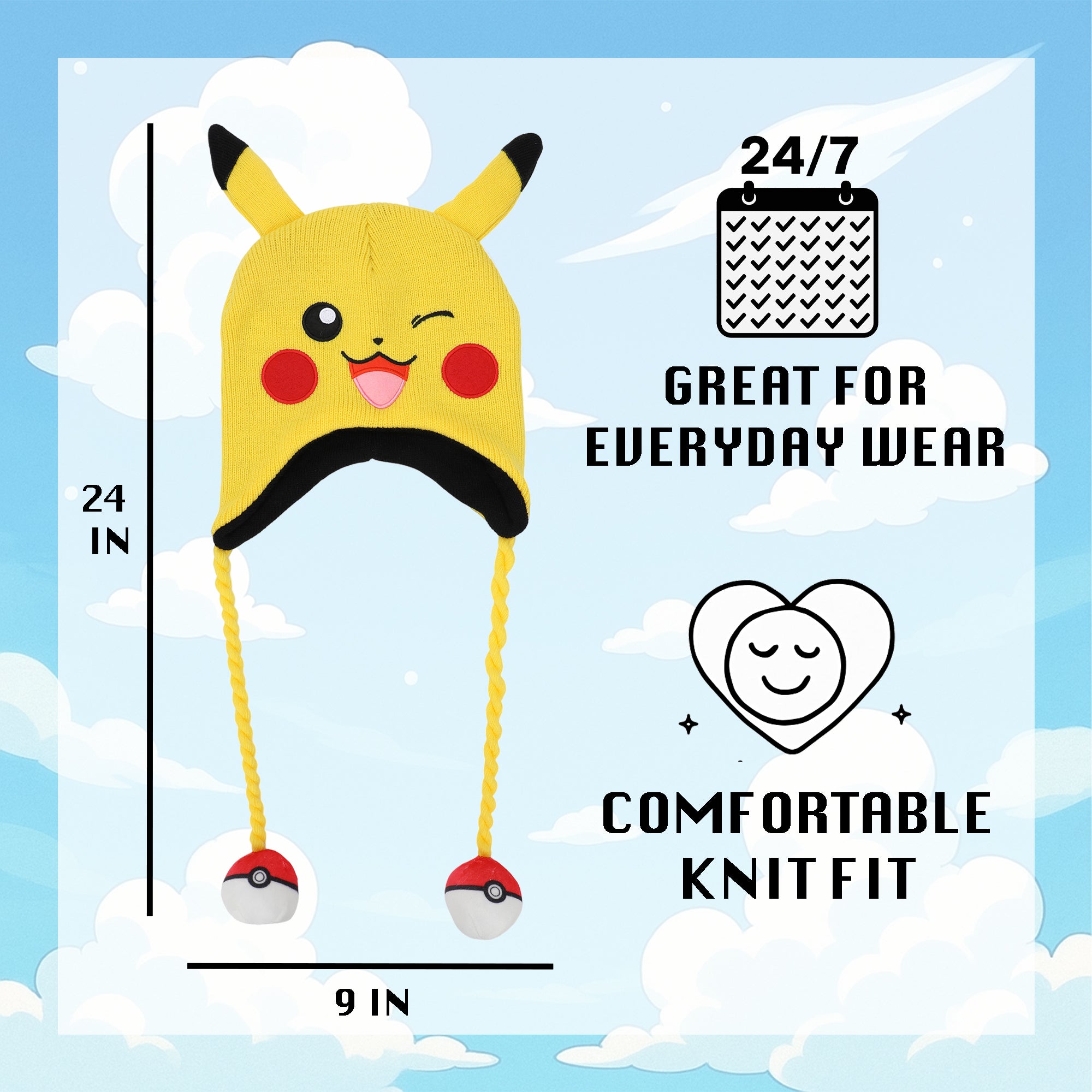 - CUSTOM DESIGNED: This adorable Laplander hat has been custom designed to resemble Pikachu, complete with 3D ears and fleece Pokéball tassels.