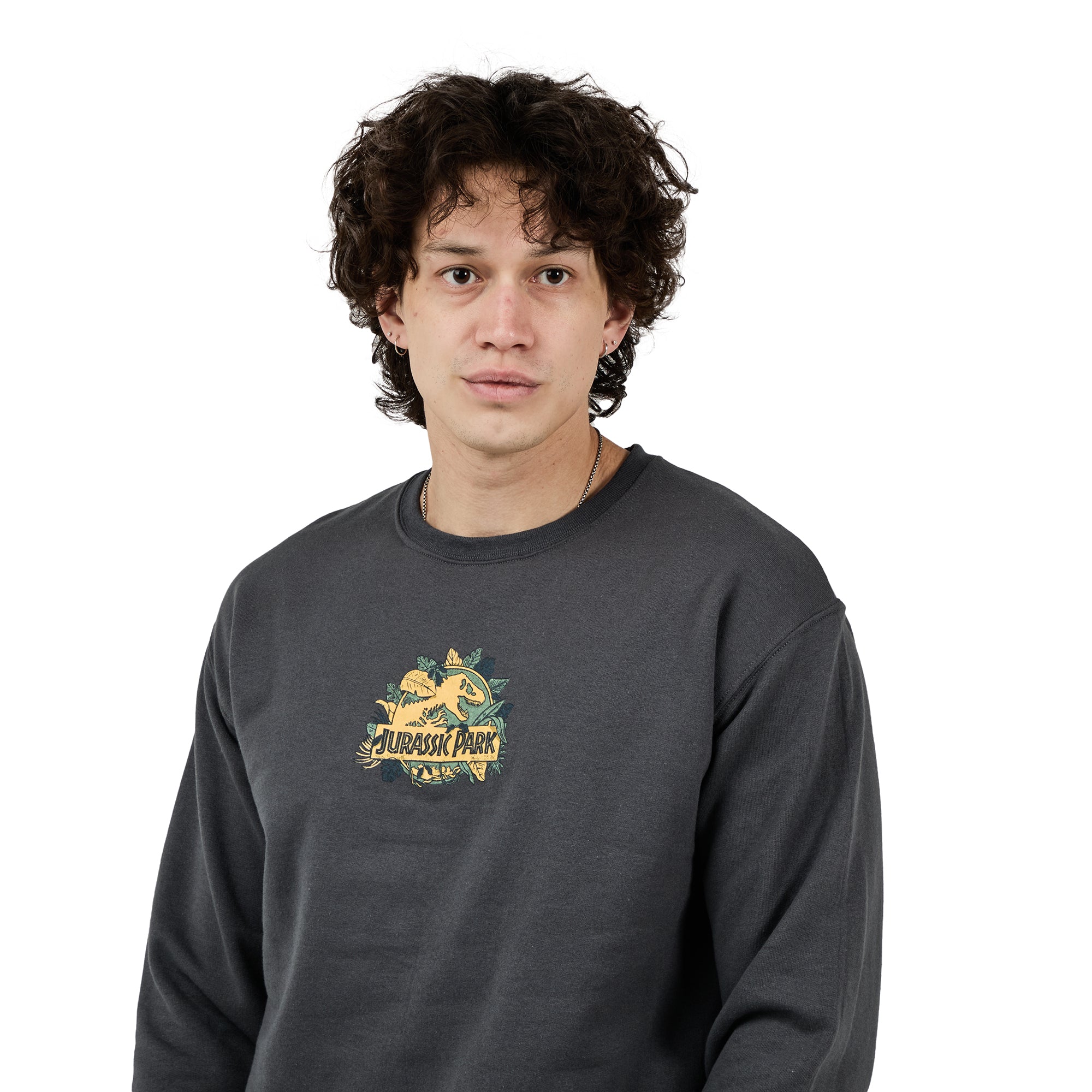 - Double-Sided Design: This Jurassic Park crew neck sweatshirt features big golden graphics of the movie's classic title logo - fun, oversized images that have been professionally printed against a charcoal gray background for long-lasting print quality.