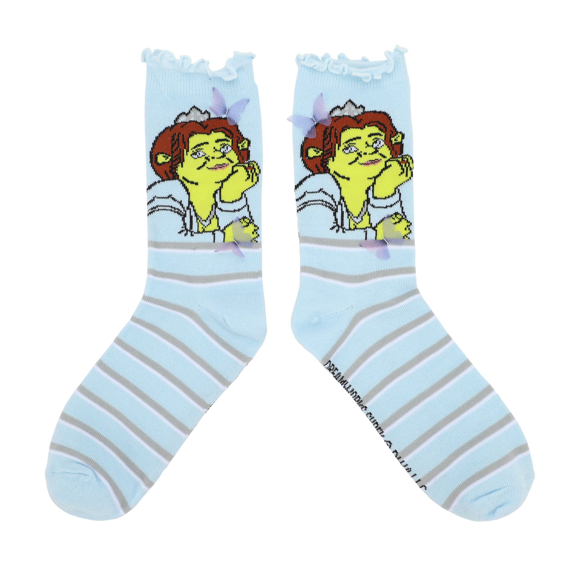 - CUSTOM DESIGN: Immerse yourself in the Shrek universe with these custom designed crew socks. Fiona's ogre form and the whimsical 3D purple butterflies take you on a journey through enchantment with every step.