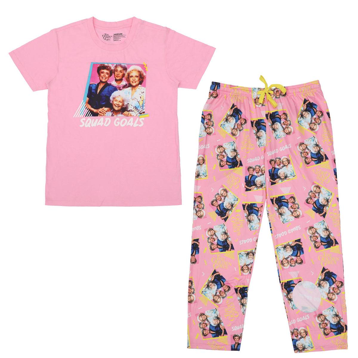 - CUSTOM DESIGN: An image of Blache, Dorothy, Rose, and Sophia above white text that reads, "Squad Goals," decorates the graphic tee in this sleep set while the stretch pants repeat the tee's design. Golden Girls fans will love this sleep set.