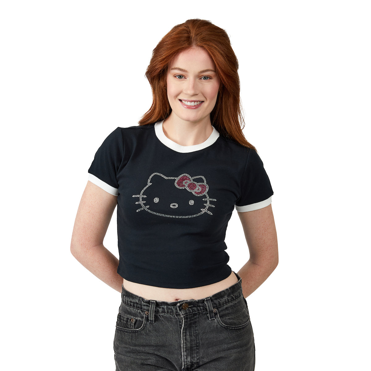 - CUSTOM DESIGN: Elevate your style with this distinctive Hello Kitty tee. The combination of white contrast hems and rhinestone art of the character's face outline sets it apart, creating a standout piece for Hello Kitty fans.