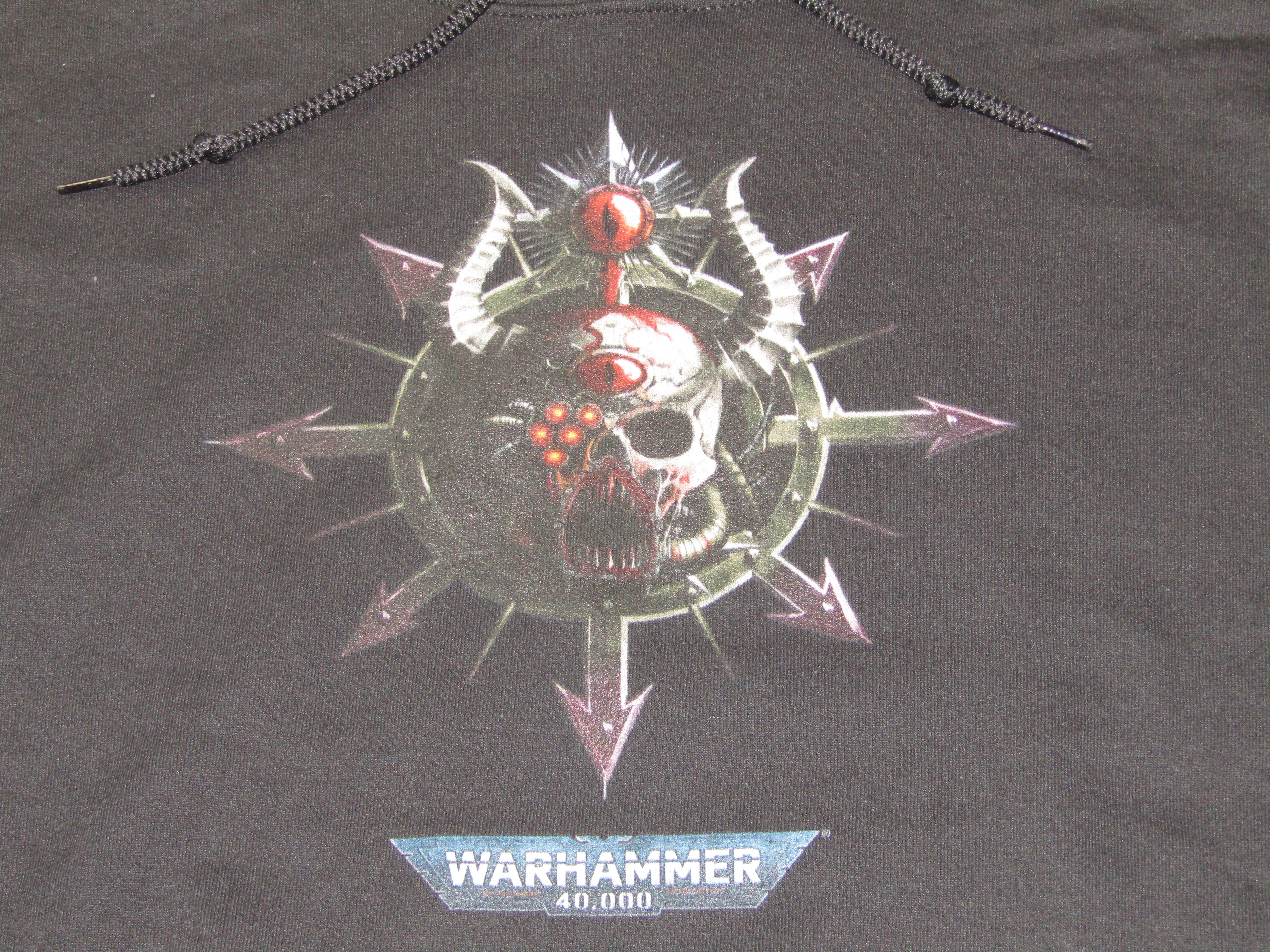 - GRAPHIC DESIGN: A skull with horns sits in front of a steering wheel in the graphic design on this sweatshirt while white letters below the image spell out the game's logo. Warhammer 40k fans will love this comfy and cozy hoodie.