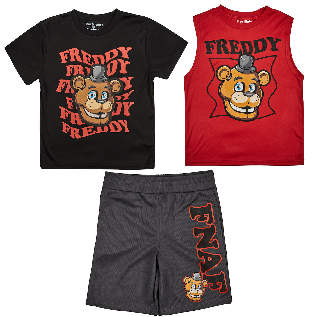 Five Nights At Freddy's 3-Pack Boy's Black Short Sleeve Tee, Red Muscle Tank, Gray Athletic Shorts Set