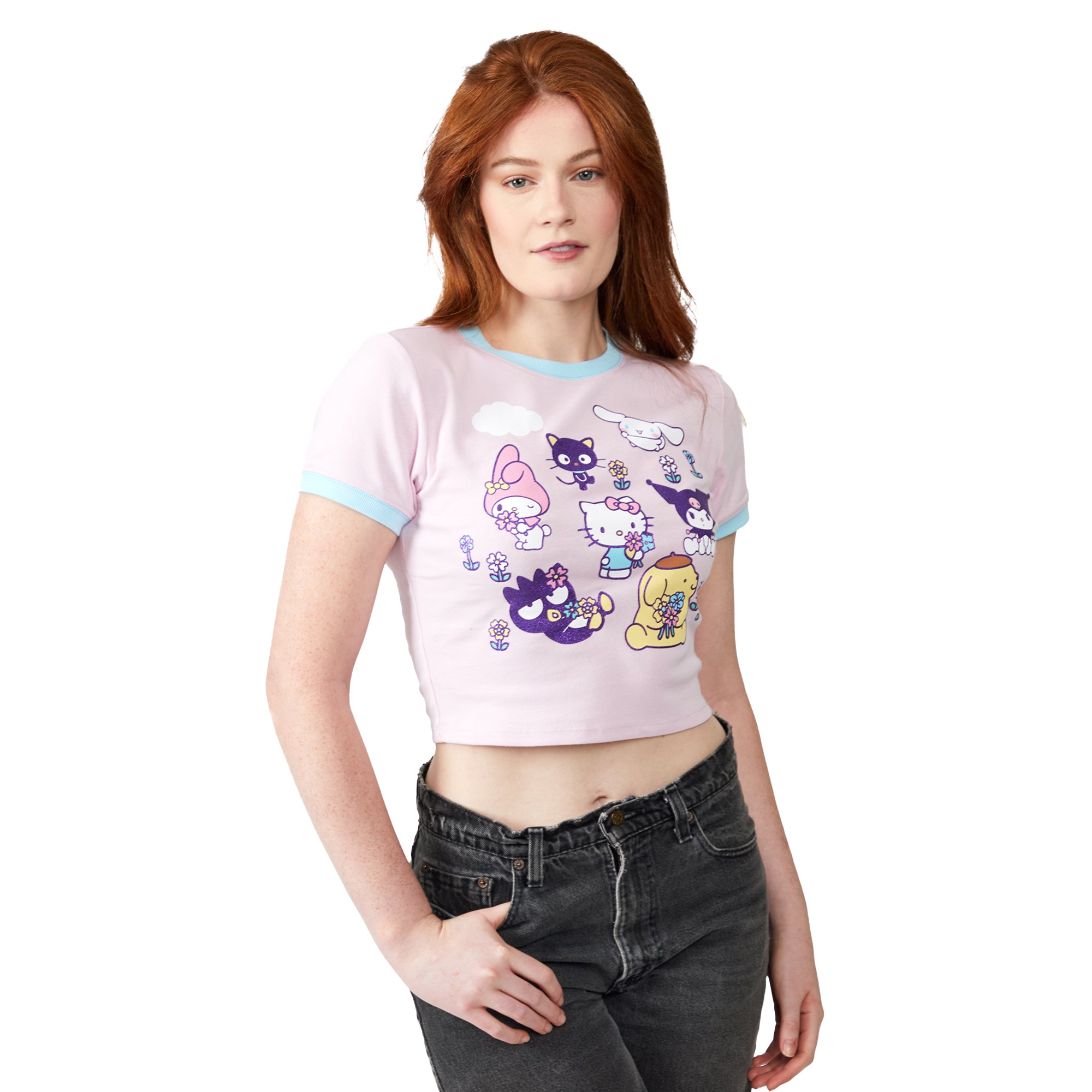 Hello Kitty & Friends Smell The Flowers Glitter Print Crew Neck Short Sleeve Pink Women's Crop TopTee