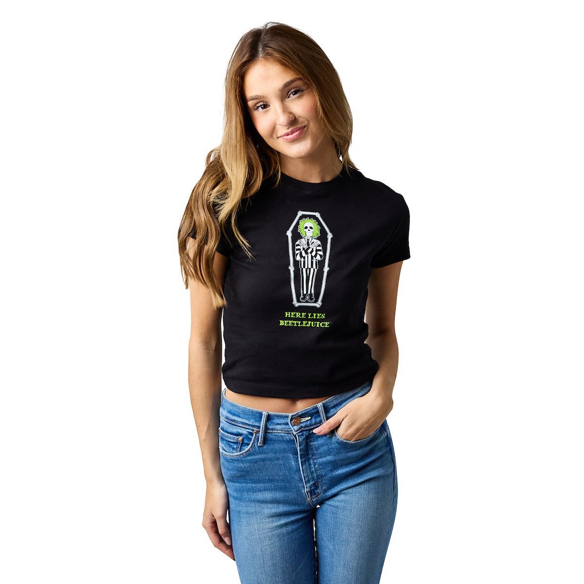 Beetlejuice Here Lies Betelgeuse Women's Black Crew Neck Short Sleeve 18" Baby Tee