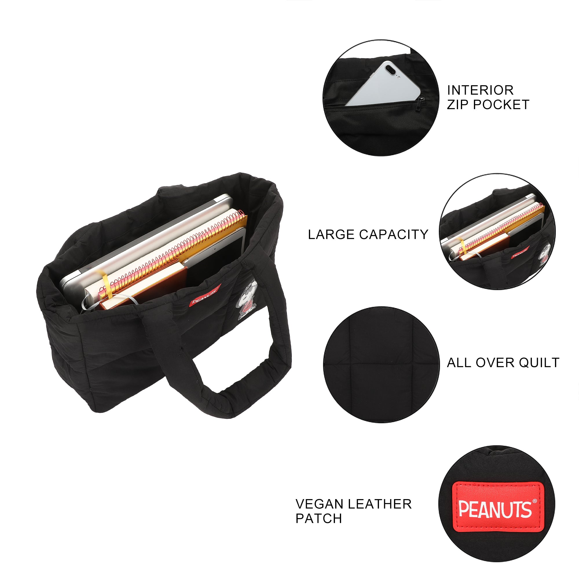 Peanuts Quilted Puffer Tote Bag with Rubber and PU Badge