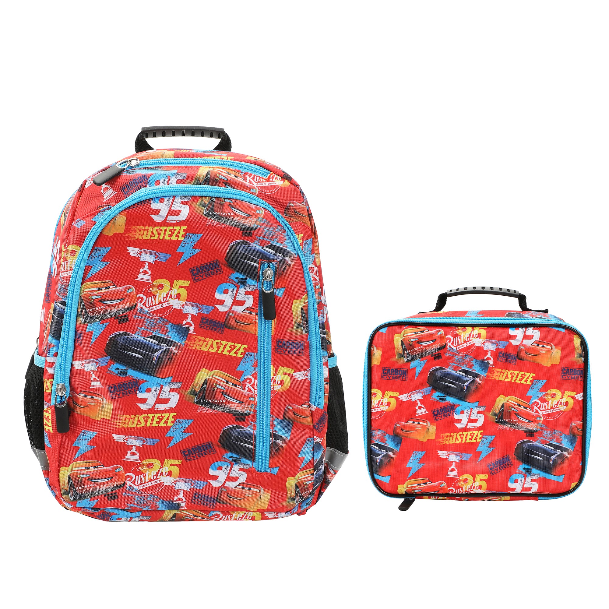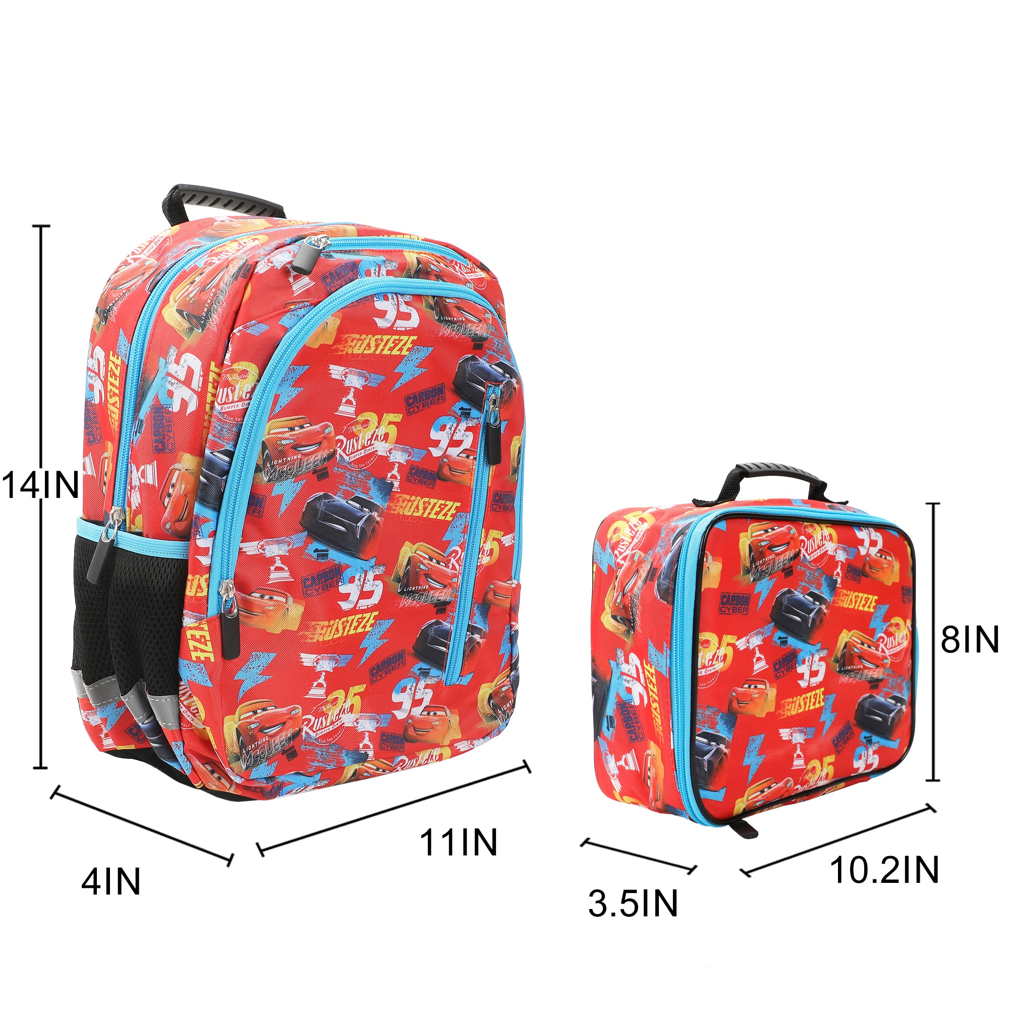 - Custom Design: Features an all-over print of Cars characters, flowers, and numbers for a bold look. Product Dimensions: 16" H x 12" W x 5" D with 8" lunch kit