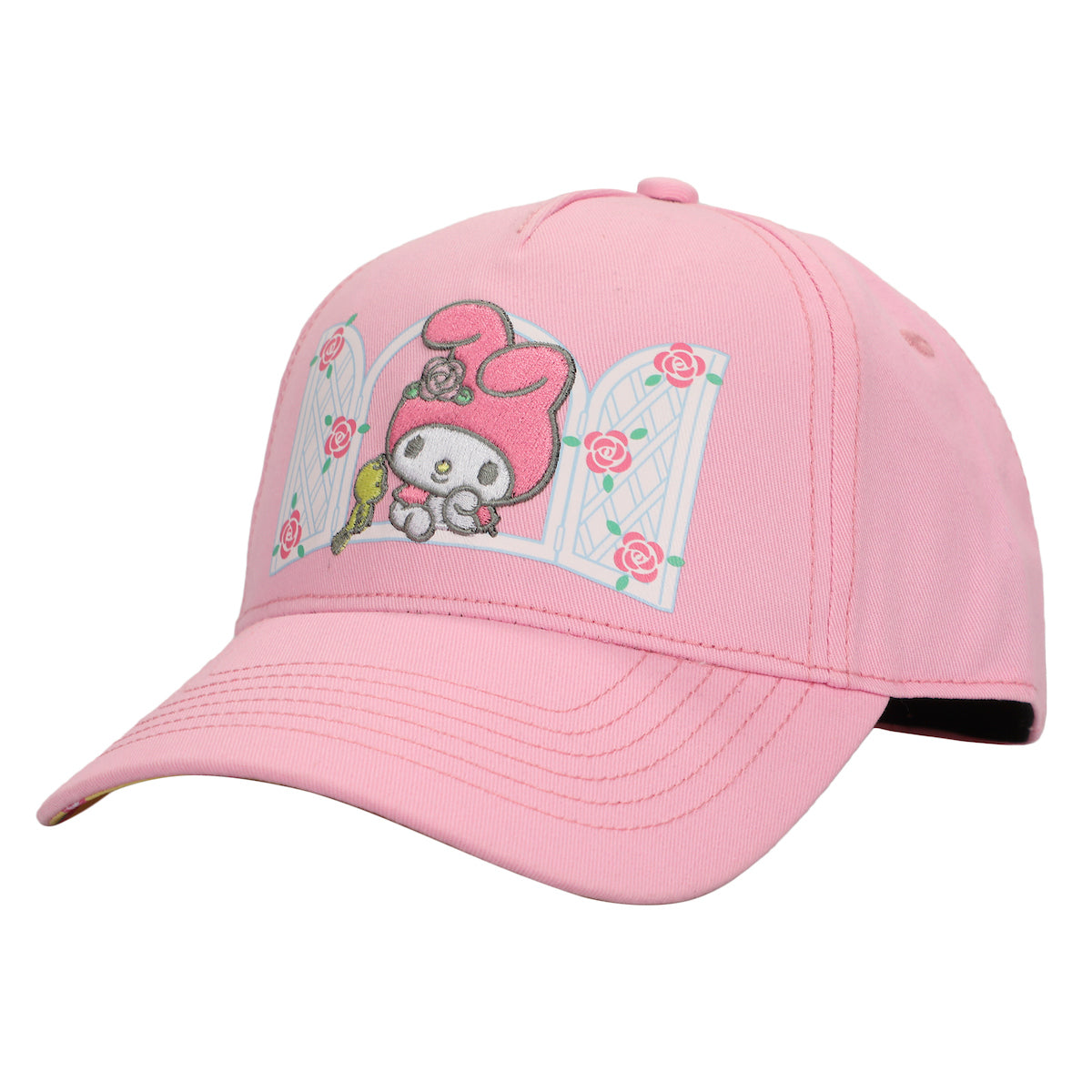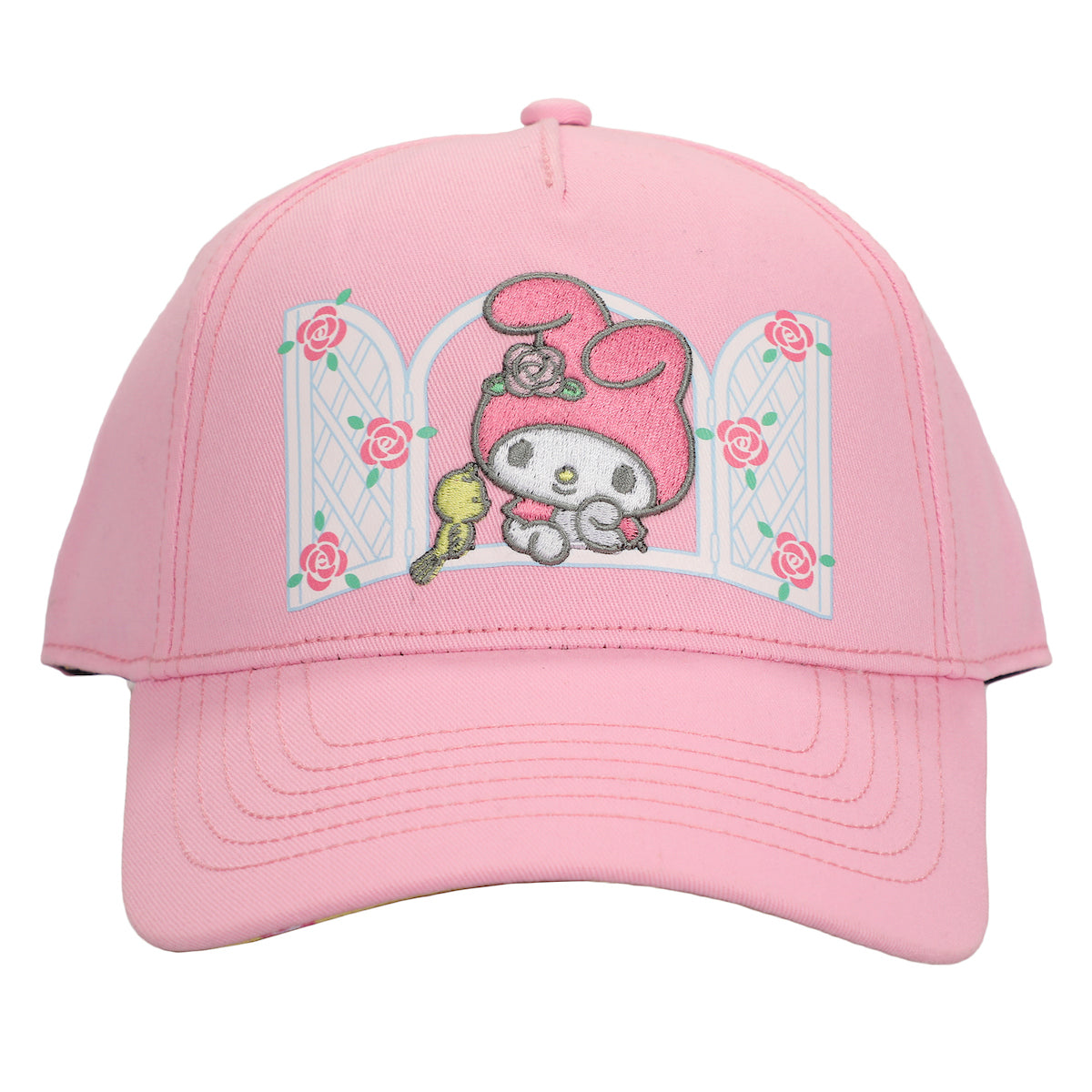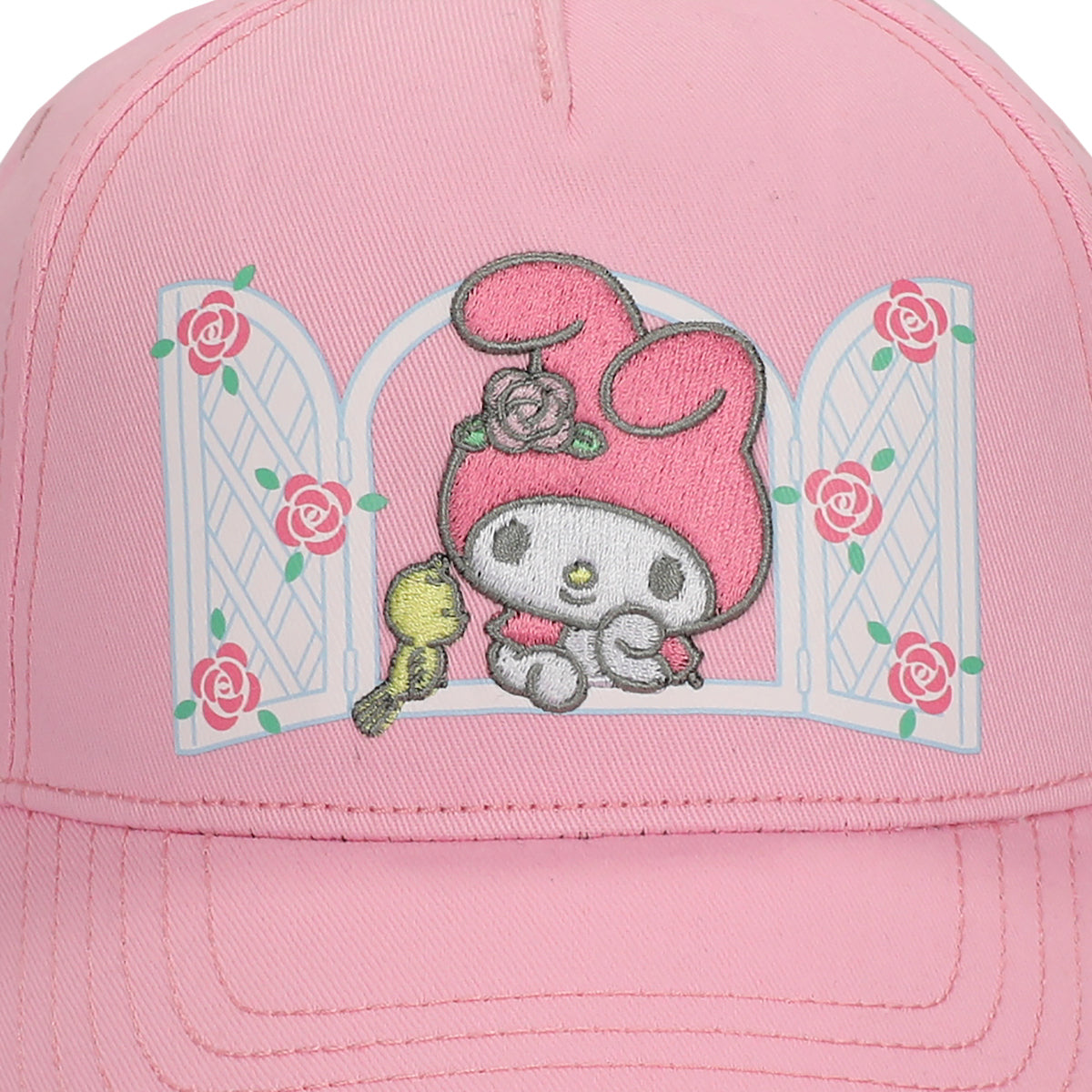 - CUSTOM DESIGN: My Melody leans against a rose-covered window and stares at a bird in the custom design on this hat while blue letters on the back spell out the series logo. My Melody fans will love this fun design.