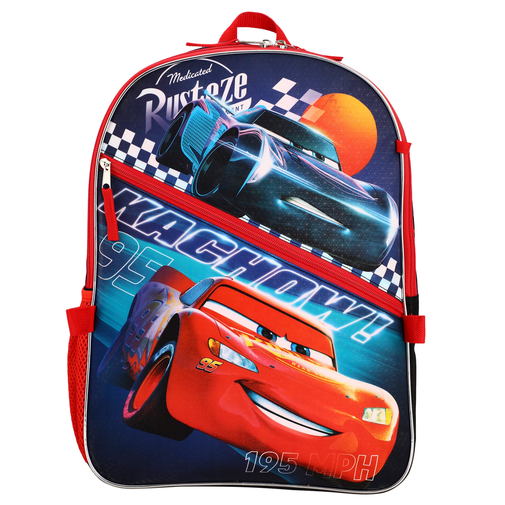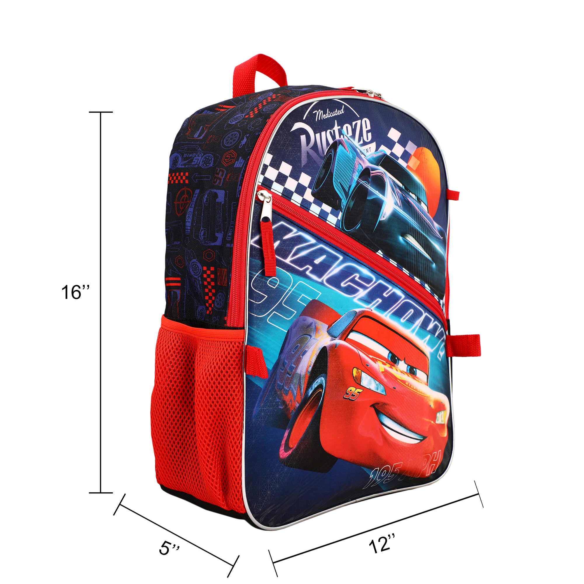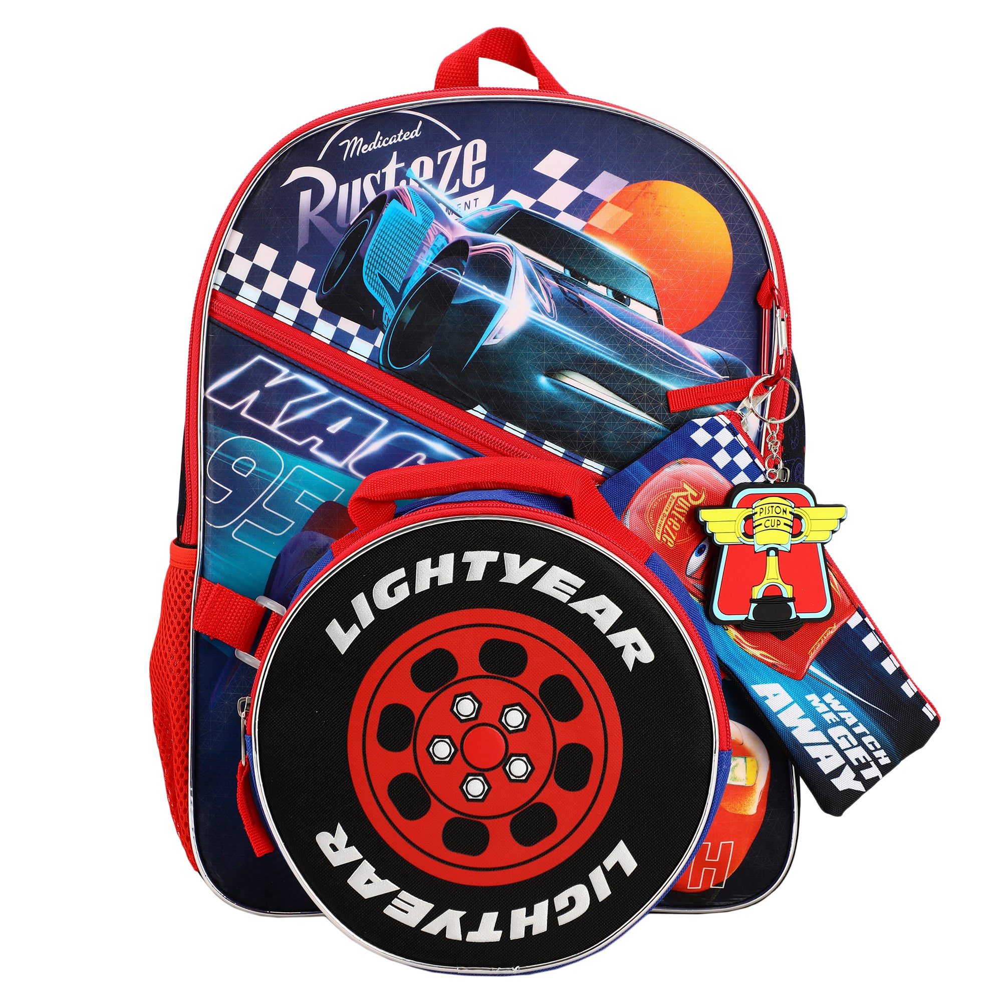 - 5-PIECE SET: The Pixar Cars 3 5-Piece Backpack Set includes a 16-inch backpack, insulated lunch bag, utility case, molded rubber keychain, and carabiner.