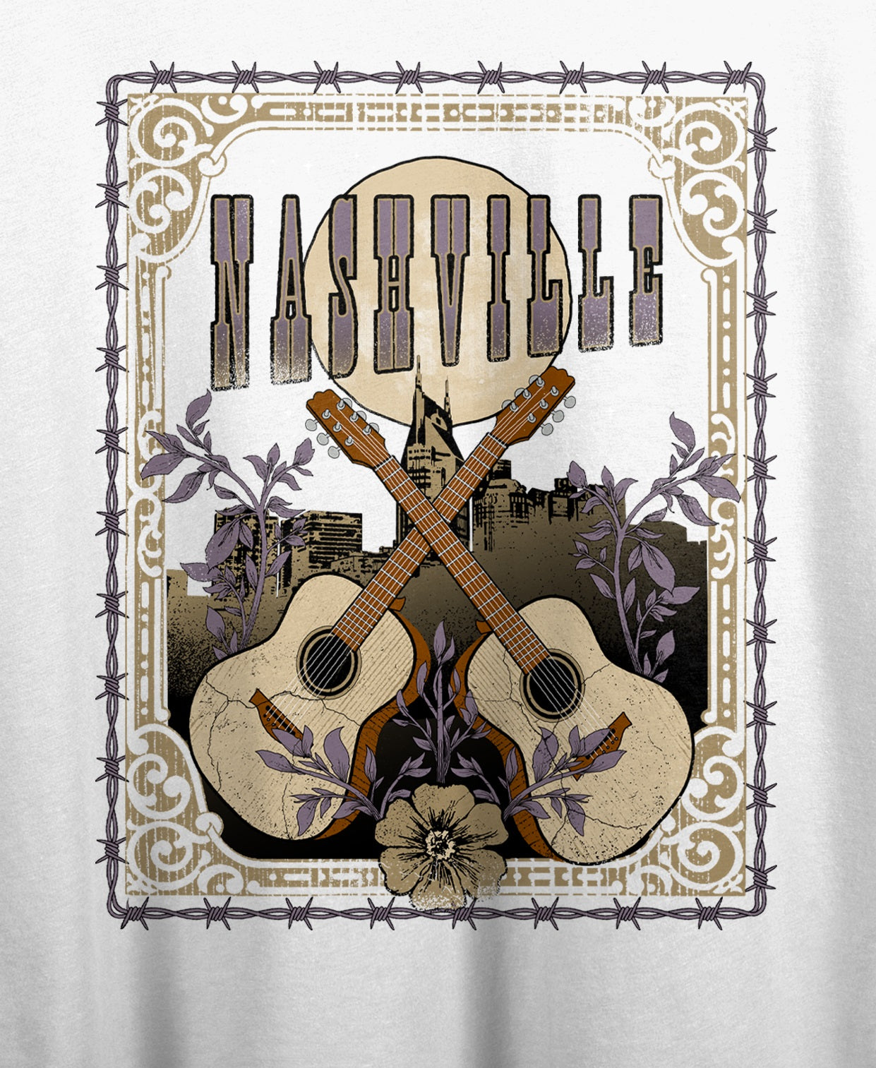 - CUSTOM DESIGN: A pair of crossed guitars appear under black letters that spell out, "Nashville," on this graphic tee while a floral distress border surrounds the image. Nashville fans will love this fun custom design.
