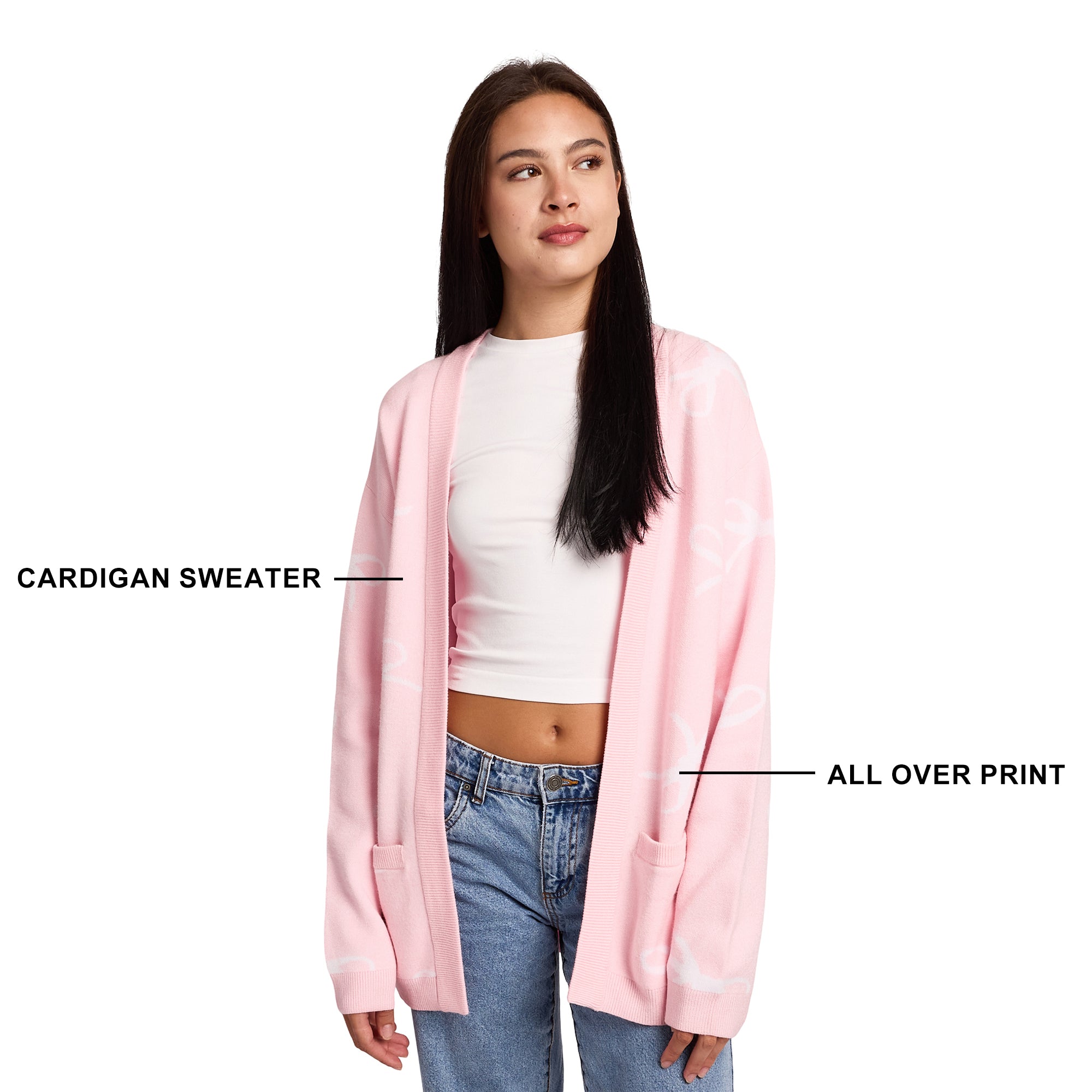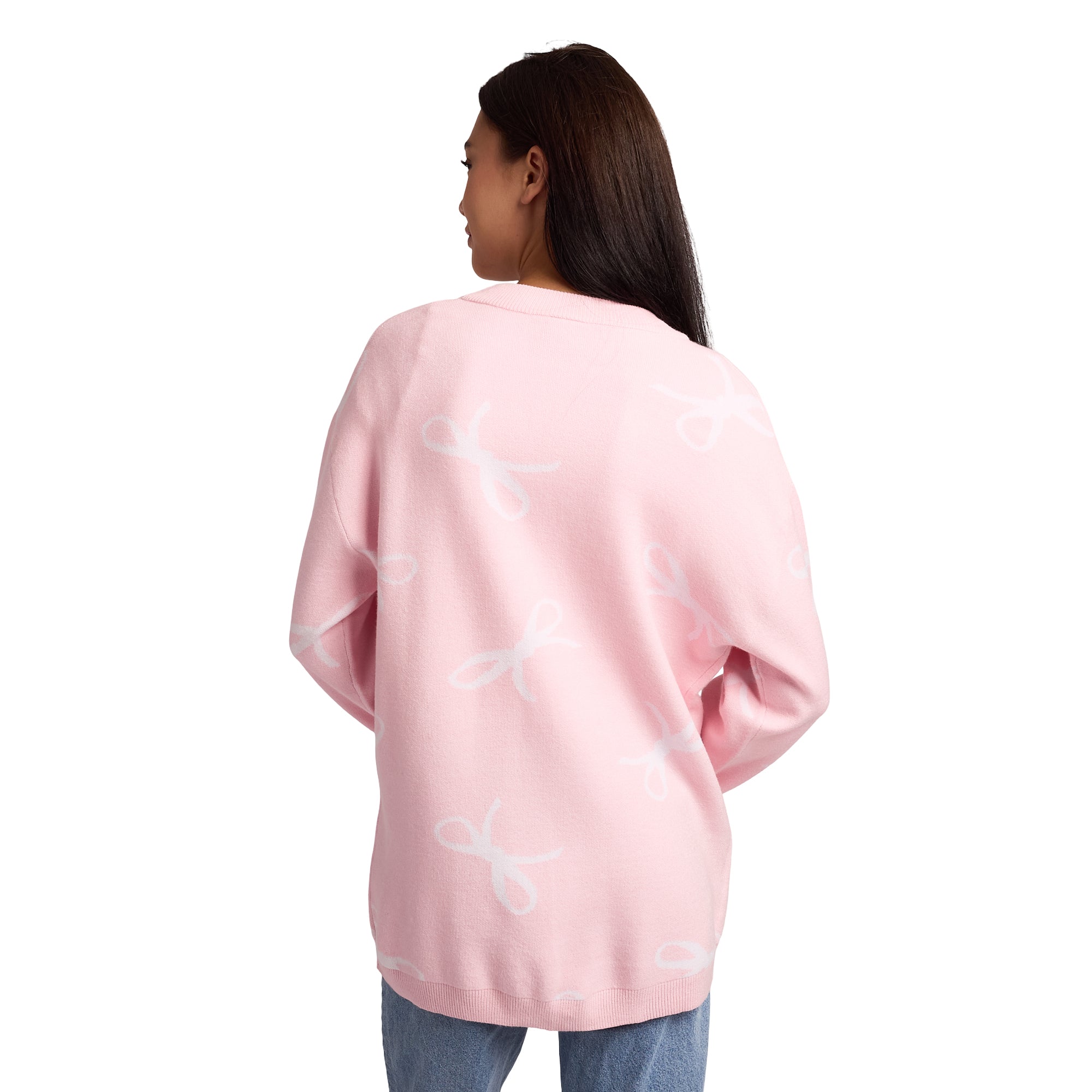 White Ribbons All-Over Print Women's Pink Long Sleeve Cardigan